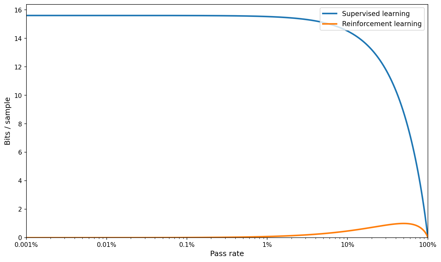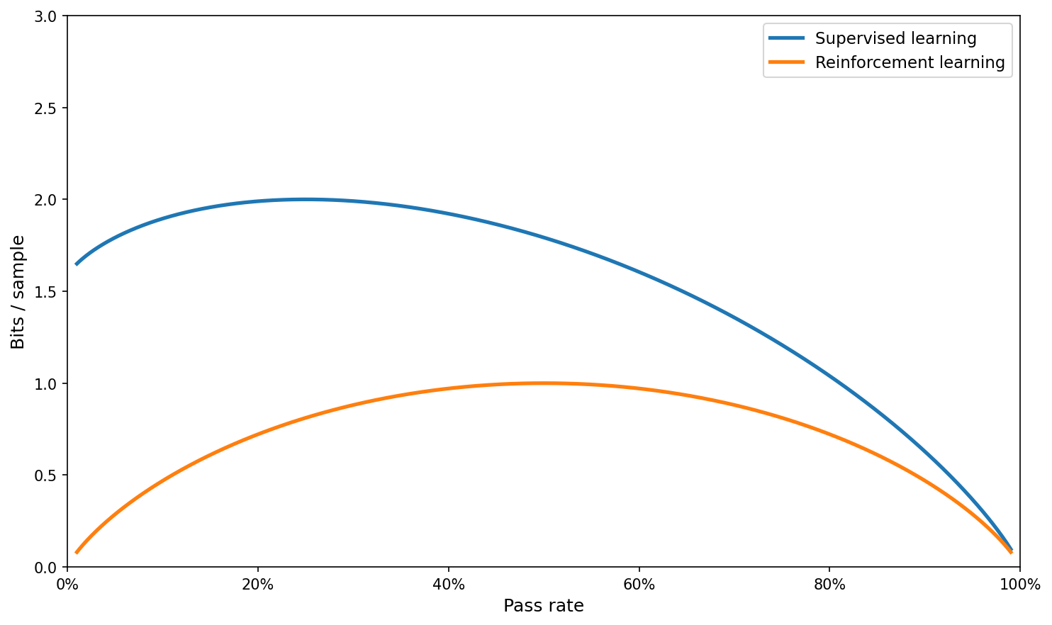 Instead, let’s produce the real plot comparing the information content of one sample (depending on whether we use supervised learning or RL) on a simple example.
