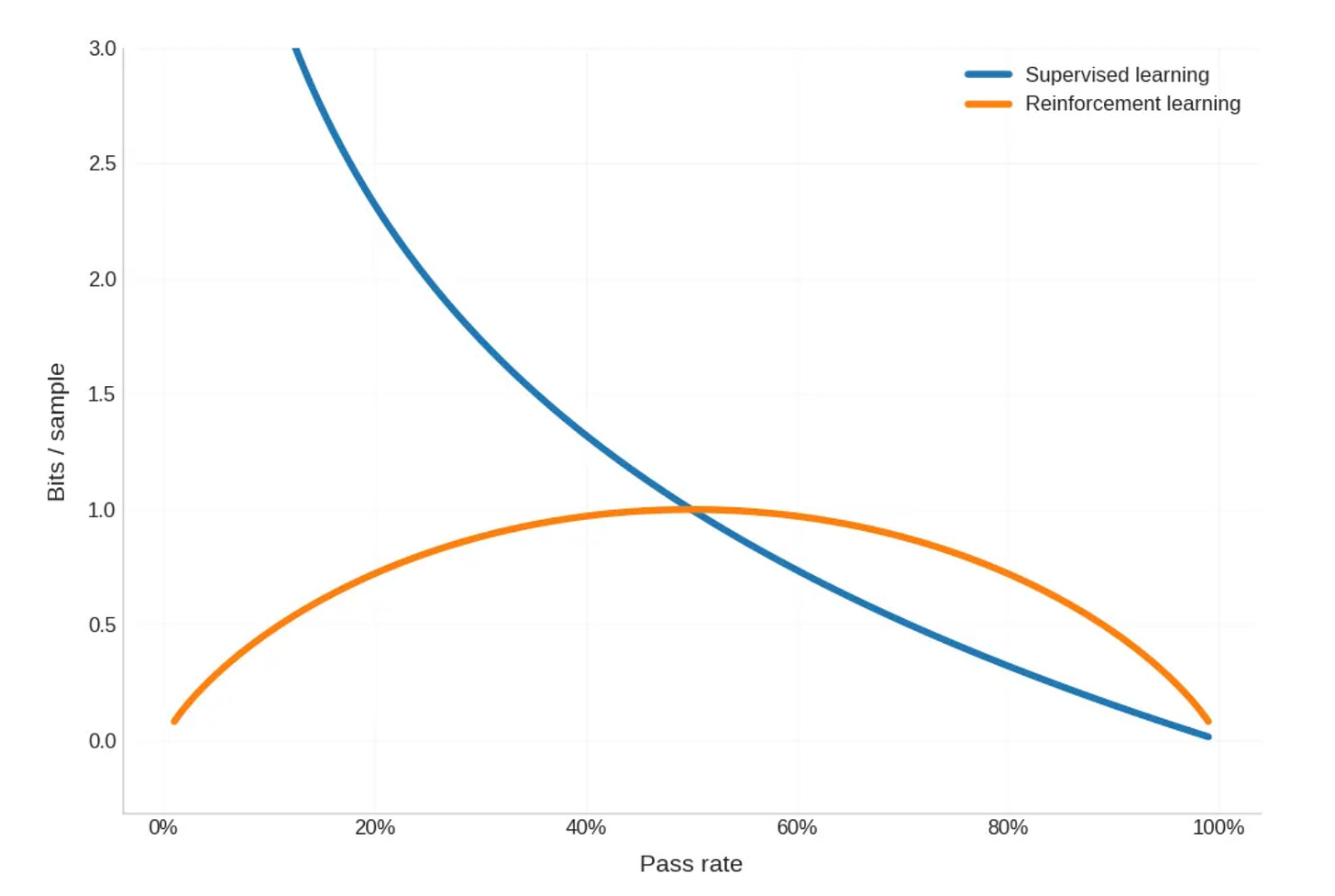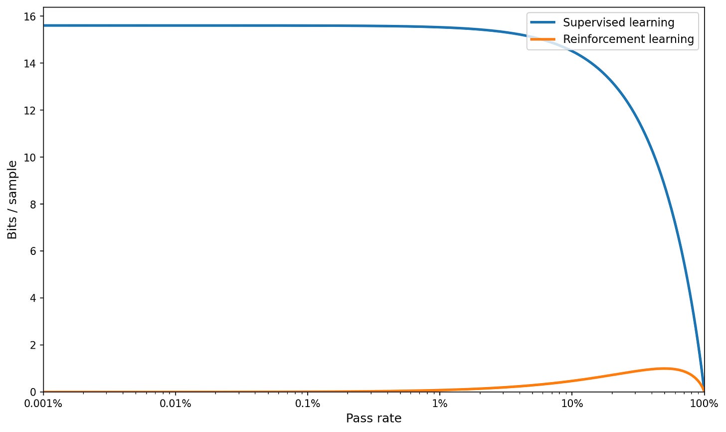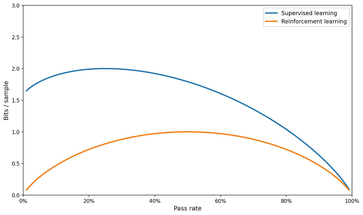 What is true is that RL is not useful at low pass rates, while supervised learning is. But this does not need information theory to explain; it’s just that RL with 0/1 rewards provides basically no signal if you almost never get it correct.