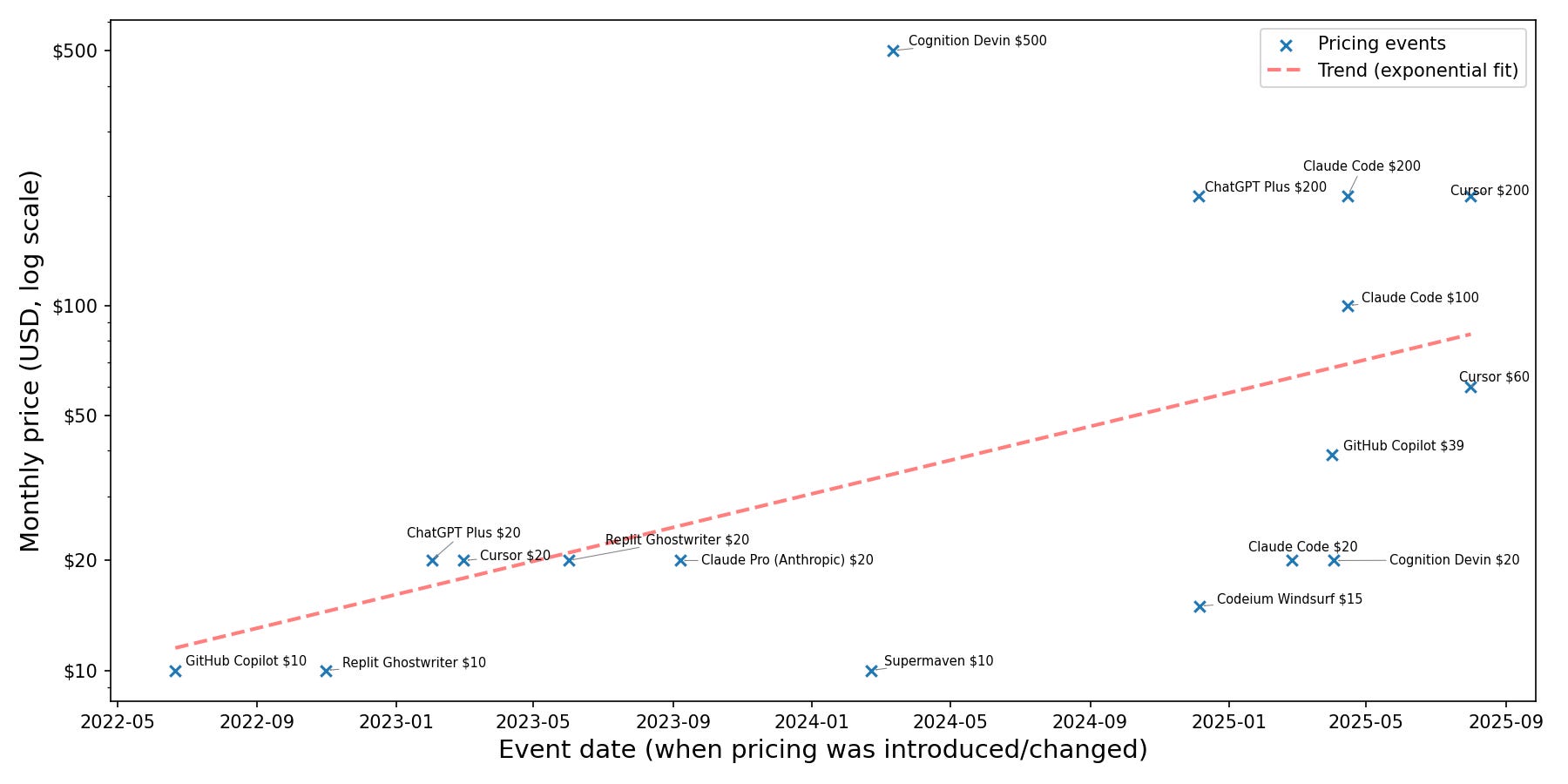 I made a plot of a bunch of tiered offerings in AI coding tools, showing an exponential trend. There are two issues with this plot: (1) the data is biased towards products I looked up; (2) if you look at the data, this is obviously multiple disjoint trends in the higher and lower pricing regime, and fitting a straight line seems like a bad idea. But I think it is nevertheless clear that there is some sort of exponential trend.